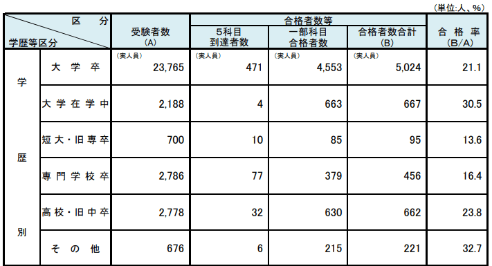 このことから、最終学歴と合格率に相関性は無く、いかに合格に向けた勉強をしてこれたかの方が重要であることが分かるでしょう。