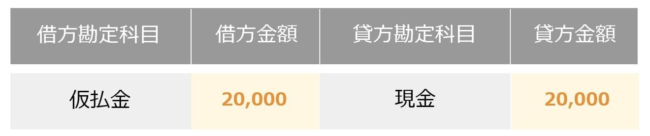 例)社員の出張旅費の概算費用として、20,000円を現金にて支払った。