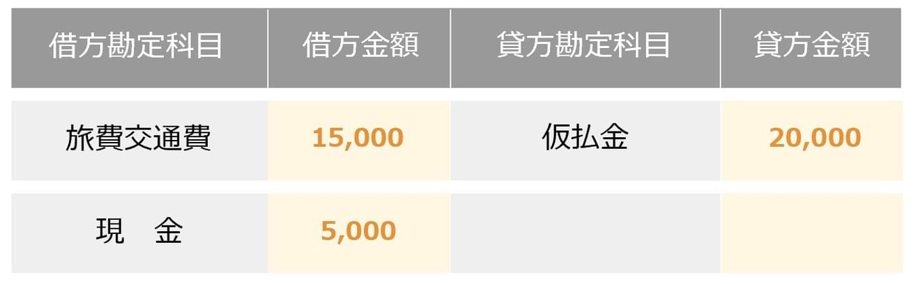 その後、出張が終わり、旅費が15000円かかり、5000円が余ったとような場合は以下のような仕訳になります。