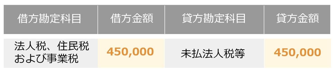 仕訳の具体例として、まず当期分の納税額が確定し、法人税20万円、住民税15万円、事業税10万円となった場合の仕訳方法です。