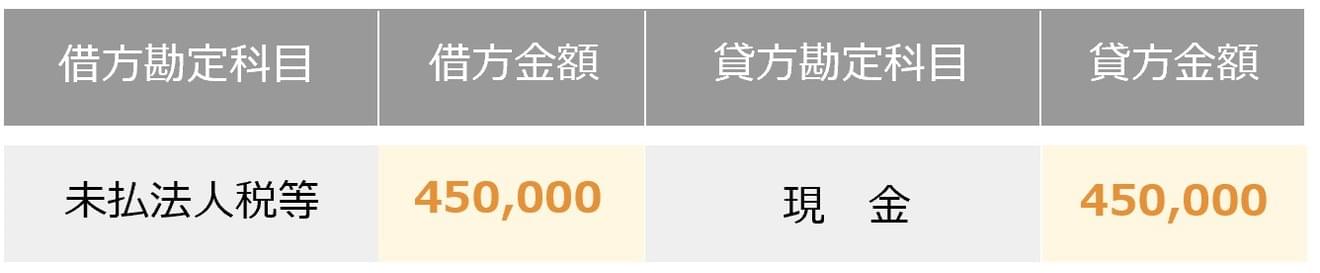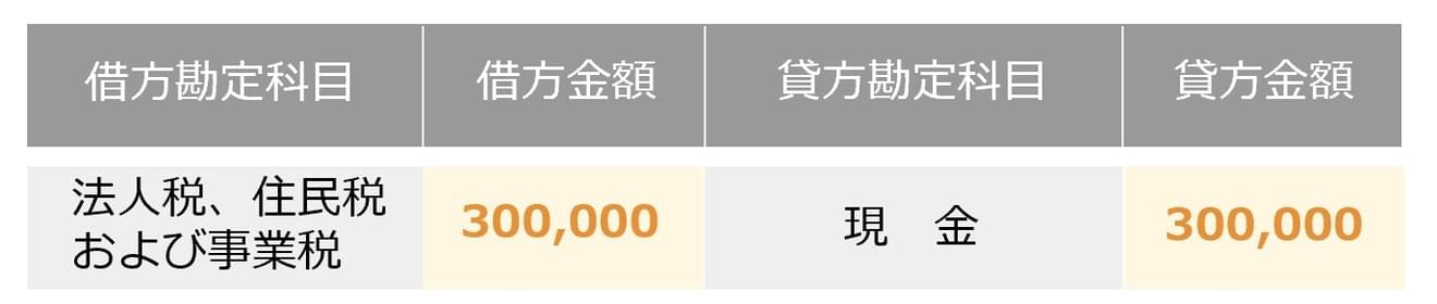 次に、未払法人税等の勘定で処理しておいた先ほどの法人税30万円、住民税10万円、事業税6万円について、現金で納付した場合の仕訳方法です。