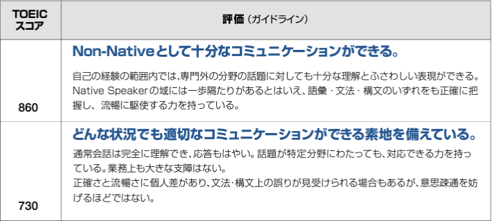 TOEIC800点以上の英語スキルとはどの程度なのでしょうか?TOEICを主催する一般財団法人 国際ビジネスコミュニケーション協会が定めている「「TOEICスコアとコミュニケーション能力レベルとの相関表」には、730点~859点のスキルおよび860点以上のスキルが示されています。