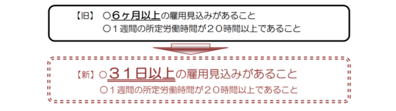 元々、「1週間の所定労働時間が20時間以上であること」については、変更前後の条件は同じなのですが、雇用見込みについては6か月以上から31日以上、