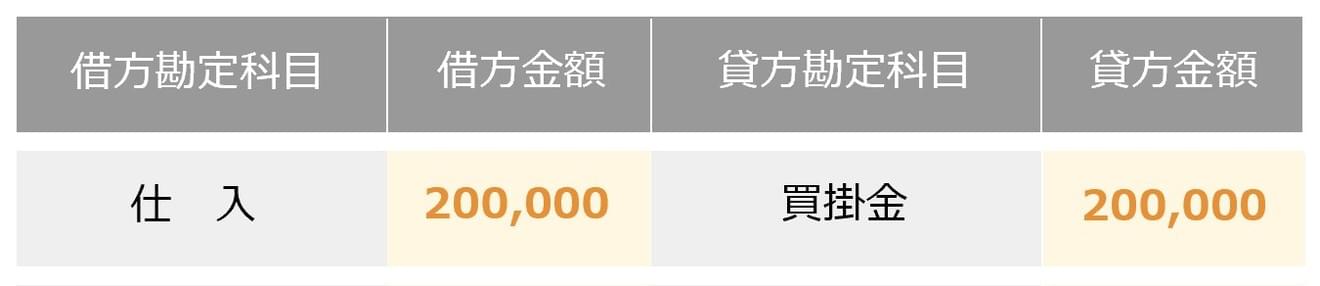 仕入として商品を20万円、掛けで払った場合の仕訳の例です。