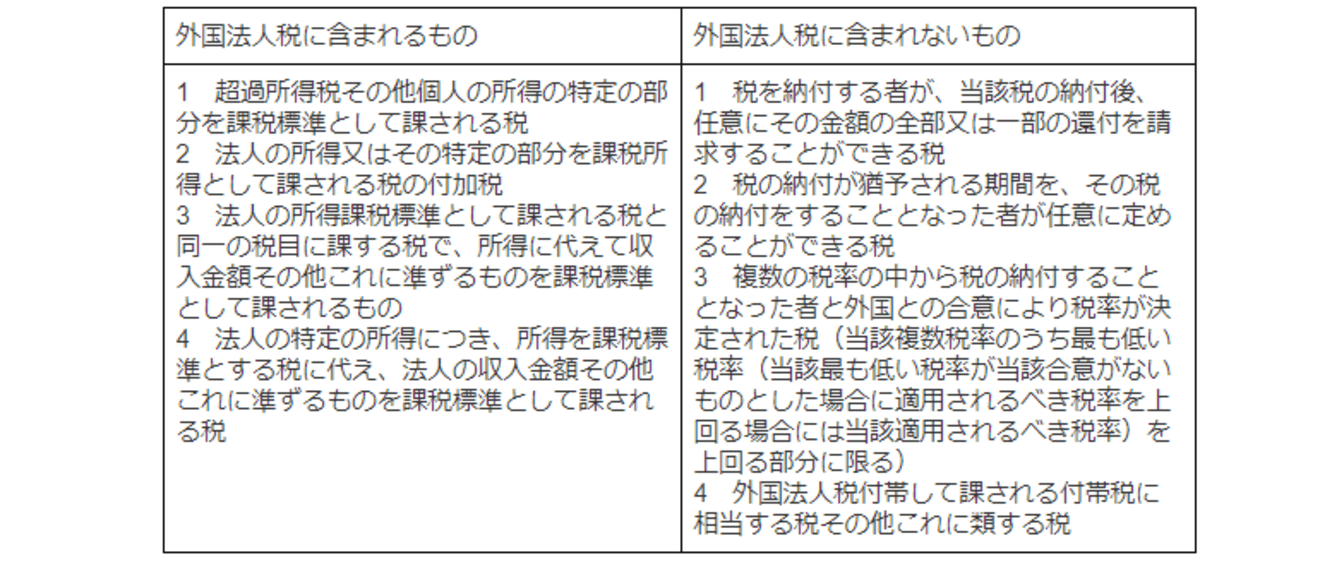 控除の対象になる外国所得税は、法人の所得を課税標準として課される税をいいます。すべての外国で支払った税金が含まれるわけではないのでご注意ください。棲み分けについては、以下の表をご参照ください。