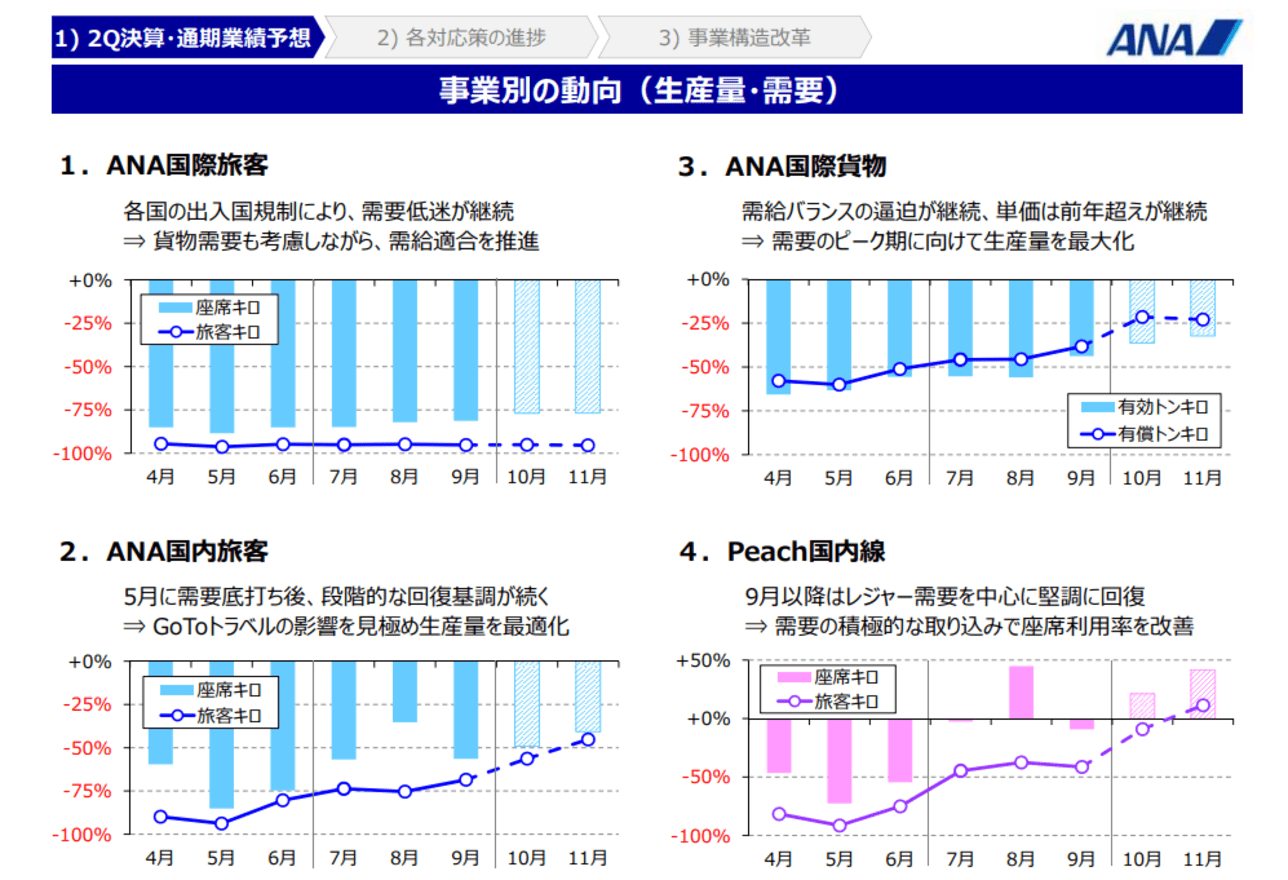 ANAは、月次輸送実績という月次資料を発表しています。その資料によると、国際線の上期の乗客数は前年比マイナス96.3%であり、ほぼ全面運休状態です。国際線については、ビジネス客や海外から帰国する日本人の需要が一定数存在することから、飛ばせば赤字を積み上げることになったとしても一定数のフライトは運航する必要があります。これが交通インフラ企業としての使命でもあることから、下期には運航数は徐々にですが増加する予想となっています。しかしながら、国際線は当面運航しても収益に貢献する見込みは立っていません。