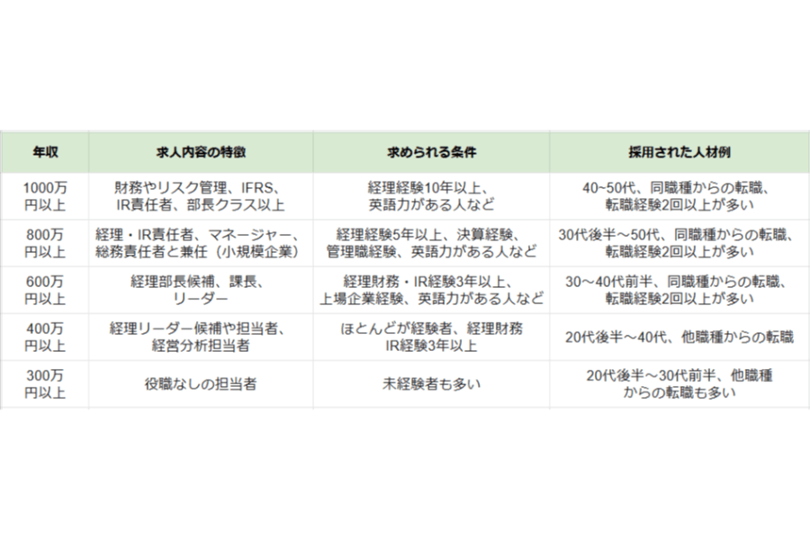 事実、転職市場の求人を見ても年収1000万円以上を提示している経理ポジションは存在します。それらの多くは部長クラス以上の管理職や、財務・IRなどを統括する責任者クラスの求人です。ある調査では「年収1000万円以上」の経理求人の条件として、「経理経験10年以上」「英語力あり」「IFRS対応やIRの責任者経験」といった要件が挙げられています。実際に採用されている人材の例を見ると、40~50代で経理畑一筋、転職経験も複数回といったベテランが多いようです。