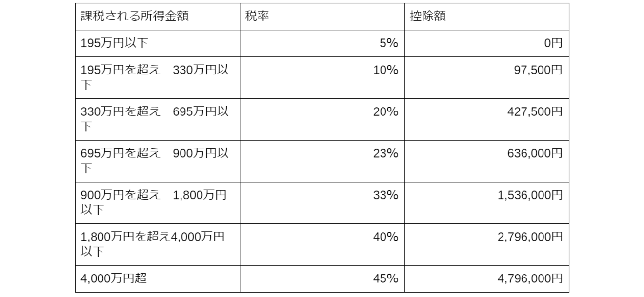 所得税は累進課税のため、5%~最大45%となっています。以下の表の「課税される所得金額」は、源泉徴収票を見ればわかりますが、医療費控除以外の各種控除を差し引いた額であり、給与や売上そのものでないことに注意しましょう。