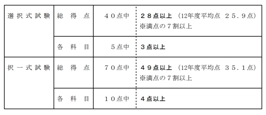 選択肢式試験は、配点40点満点のうち合格基準点は約23点、短答式試験は、配点70点満点のうち合格基準点は約45点と設定されています(実施年度によって合格基準点が上下する点にご注意ください)。