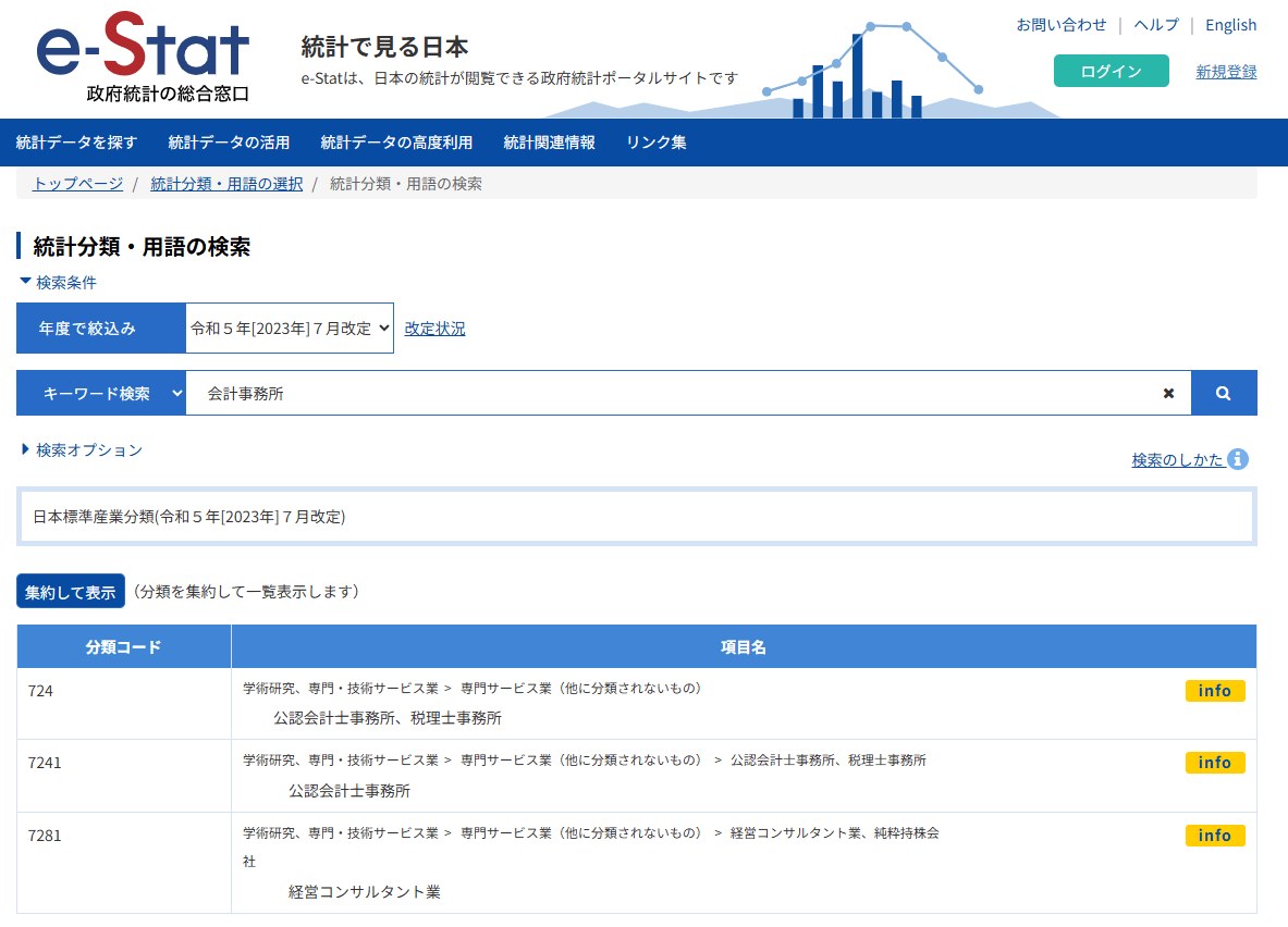 政府統計のポータルサイトであるe-Statにおいて、日本標準産業分類というものを確認することができます。こちらで「会計事務所」の業種を調べると以下のように表示されます。