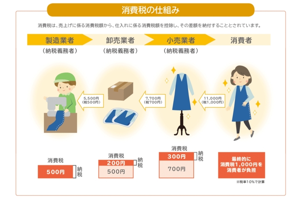 消費税は、生産、流通などの各取引段階でそれぞれ課税され、価格に上乗せされた消費税を最終的に消費者が負担する仕組みです。消費者が支払の際に負担した消費税は、納税義務者である事業者が納めます。