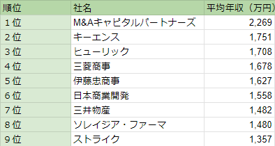 日本の平均年収ランキングを見ても、M&A業界の年収が高いことがわかります。東洋経済オンラインによると、堂々の1位は上場企業平均年収ランキングにおいて、9年連続で1位を取り続けているM&Aキャピタルパートナーズです。
