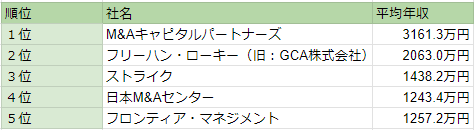 M&Aキャピタルパートナーズの平均年収は3161.3万円であり、2位までと大きな差がつく形となりました。