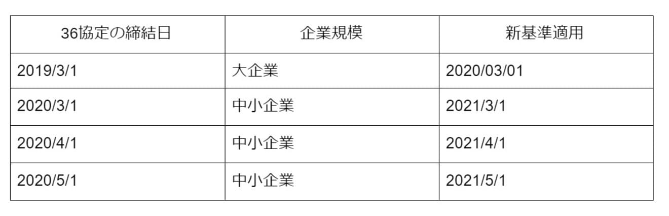 新しい36協定の適用については、2019年4月、中小企業では2020年4月以降とされていますが、この適用というのは「36協定を締結した日が適用日以降である」というのがポイントです。