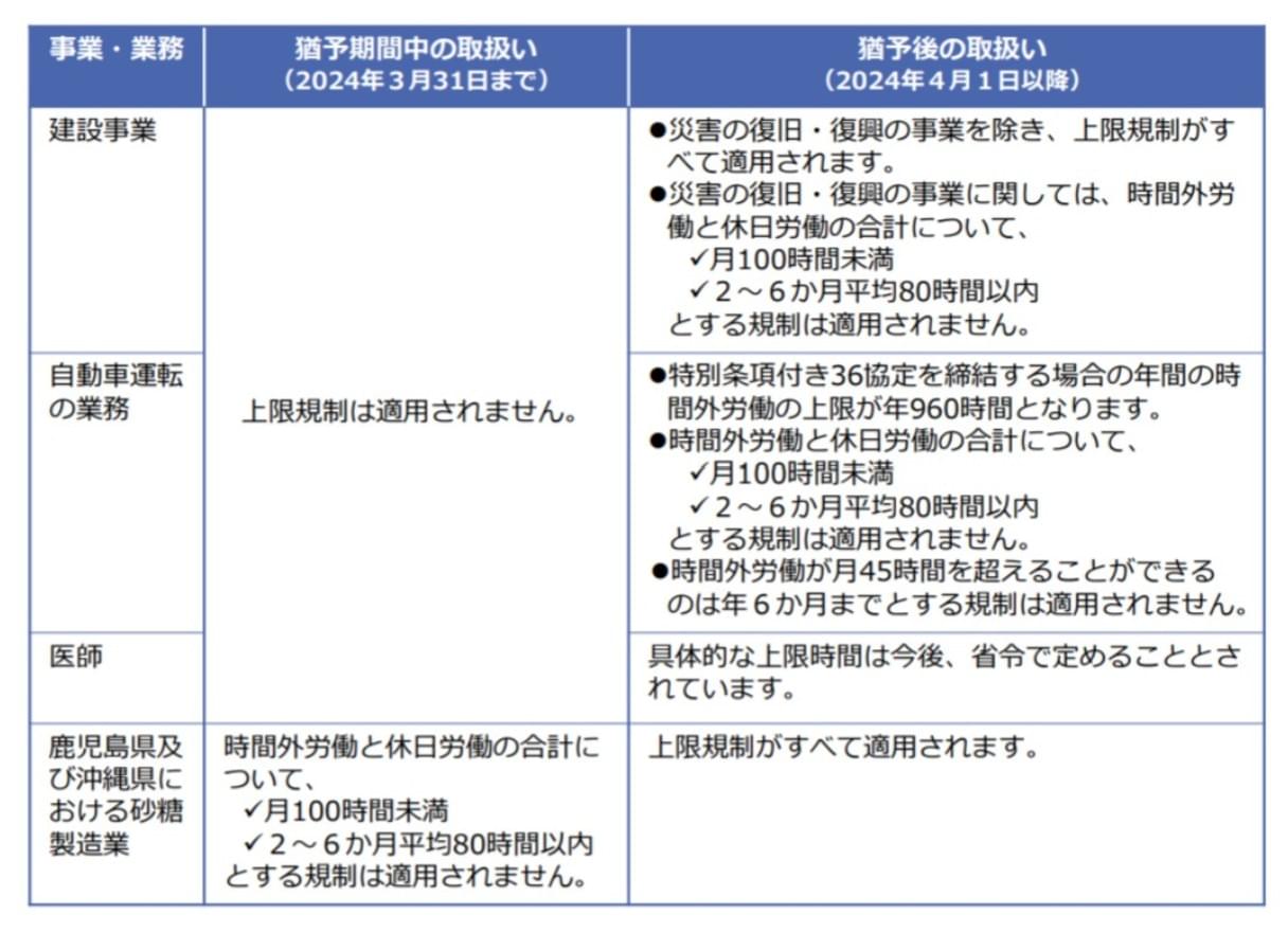 災害復旧や東京オリンピックなどで大きな需要が見込まれる建設業界など、以下の事業・業務に着いては上限規制の適用が2024年3月31日までさらに猶予されます。