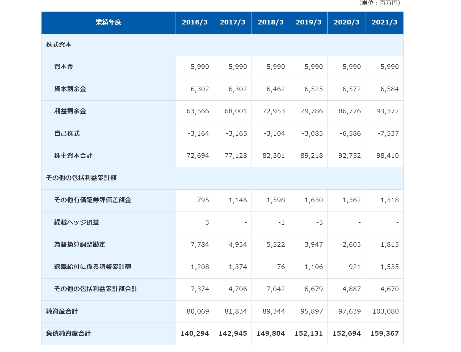よって、純資産=自己資本となります。6年間を通じて80,069(百万円)→103,080(百万円)と増額していることが見て取れます。