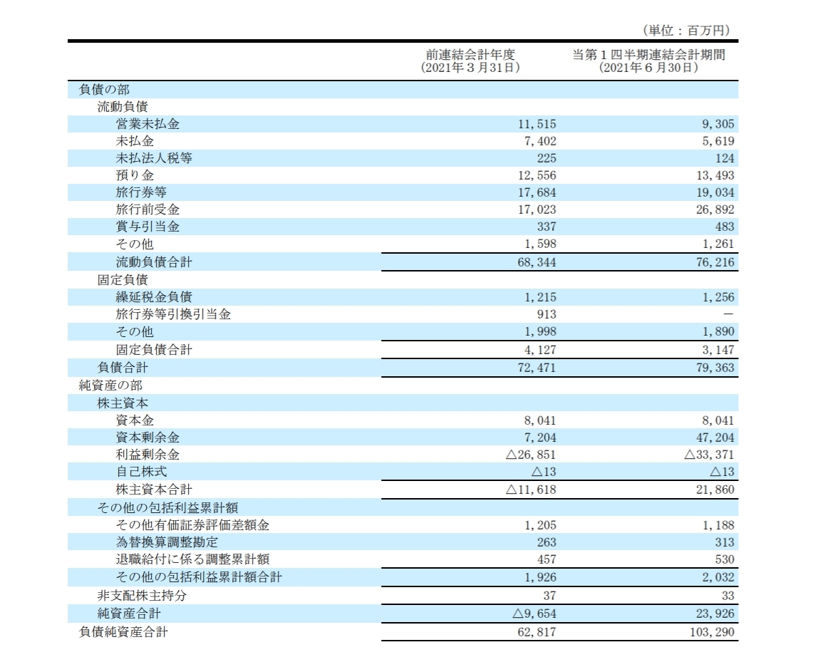 2021年3月決算で社、純資産合計欄を見ると96億54百万円の債務超過となっており、企業として継続が危ぶまれる状況でした。しかし、新型コロナウイルスの影響で、本業の旅行業では利益を出すに至っていません。そこで、第三者割当増資に伴う資本剰余金の増加をおこない、債務超過を脱しています。