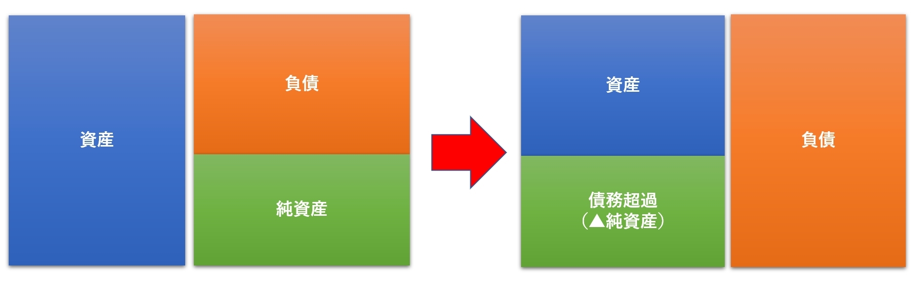 赤字が累積することにより、負債が資産を上回ってしまい、純資産(自己資本)の合計額がマイナスになっている状態です。こうなると、自社の資産をすべて売却しても負債を返しきれません。