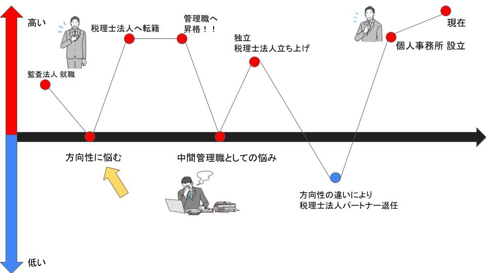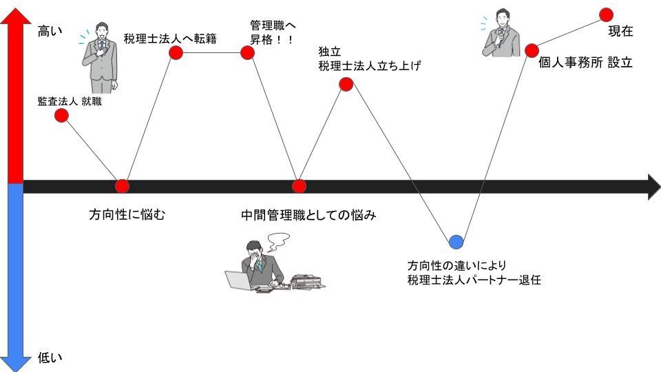 家庭の事情もありトーマツを退職し、併せて独立しました。その後半年ほどして落ち着いたときに、とある先生からお声かけいただき、共同代表として税理士法人を設立しました。そのままトーマツで頑張る楽しみもあったのですが、独立にも興味もあったので流れに身を任せる形で進んでいきました。その後共同代表の先生とは方向性の違いもあり、袂を分かつことになり、2019 年、38 歳で今の個人事務所を構えることになりました。