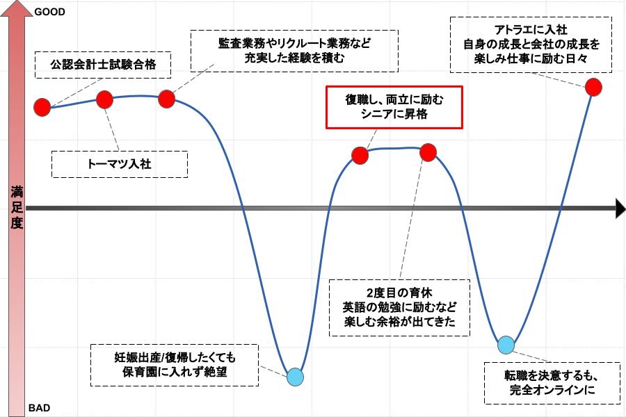 シニアの次のポジションはマネージャーなのですが、マネージャーは上場企業の主任が求められるポジションなので、「育児との両立は難しそうだな」と思っていました。マネージャーをある程度経験してから出産をして業務量を減らす、というパターンは当時もあったのですが、もともと子供がいる女性がマネージャーになるケースはほとんどなかったからです。そのとき「将来的にはキャリアを考える必要があるかも」と思ってはいました。