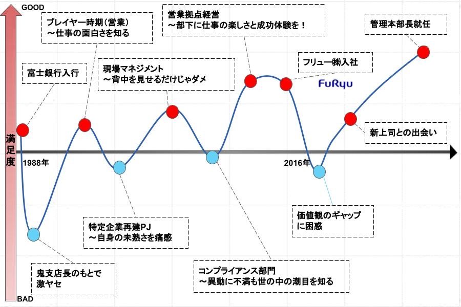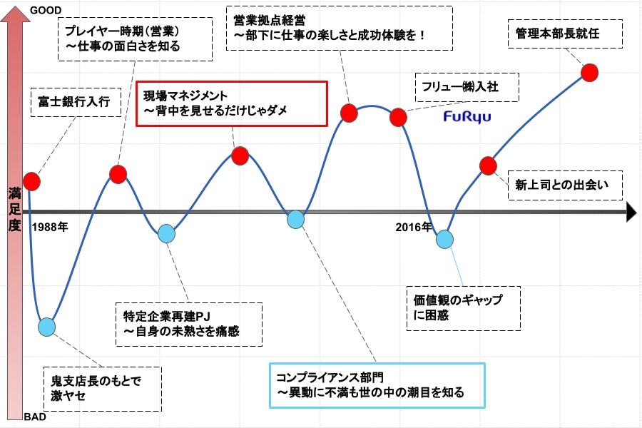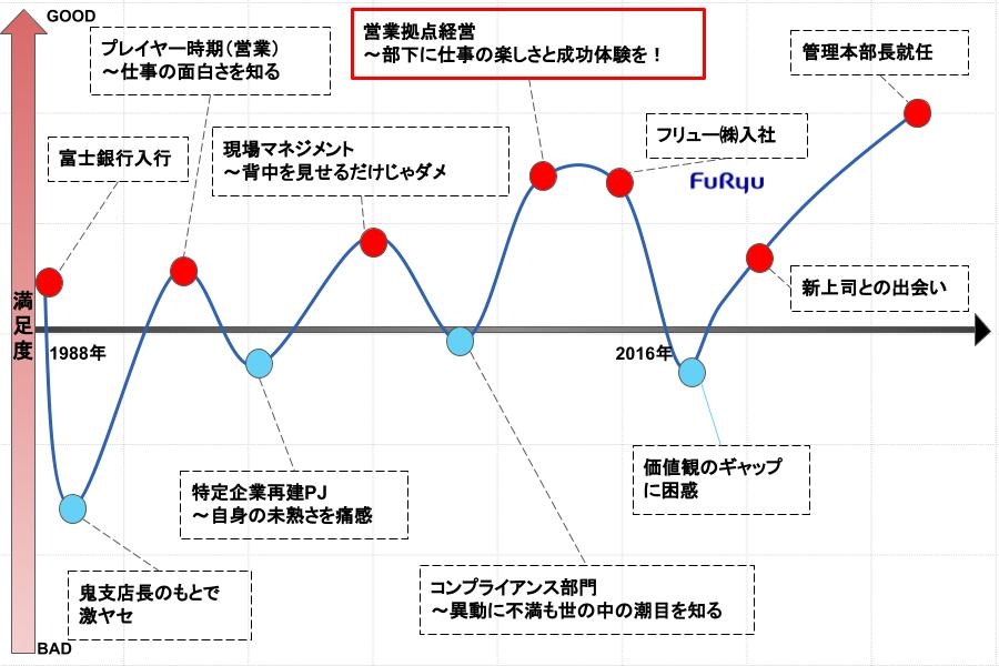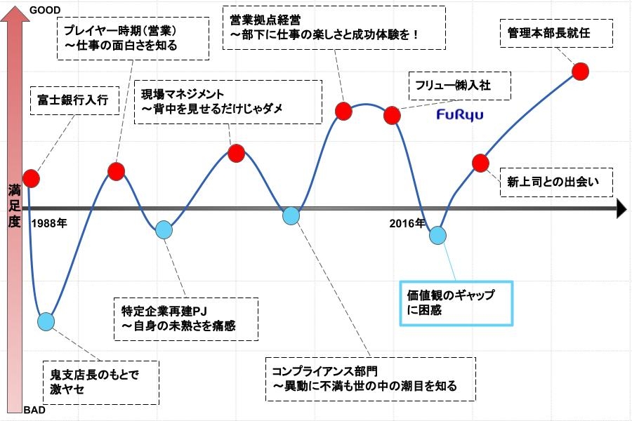 私の場合は3年間支店長をやって、2016年の4月1日に人事から「次は出向になります」と言われました。その後、「あなたの行く候補先はフリューです」と銀行の人事から現在の会社を紹介されました。