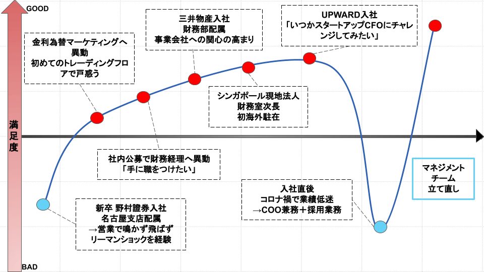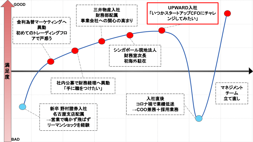 野村證券を退職するときには、既に事業会社のCFOというポジションをキャリアの視野に入れていました。財務経理に携わる人間にとっては、会社のファイナンスを一手に担うCFOは目指すべき最後のゴールポジションではないでしょうか。ただ、野村證券を退職した時点で私はまだ30歳ぐらいで経験も少なく、機は熟していませんでした。その後三井物産で経験を積んだことで、そろそろCFOを狙ってみよう、スタートアップ企業が面白いのではないかと考えていたときに、ある投資家の方にUPWARDを紹介していただいたことがきっかけです。その投資家とはDNX Ventures日本代表の倉林さんであり、彼が三井物産OBというご縁で知り合うことができました。現在もUPWARDの社外取締役として支援いただいている関係です。