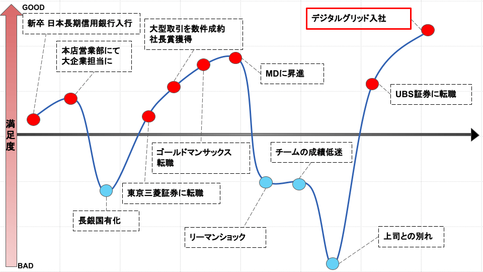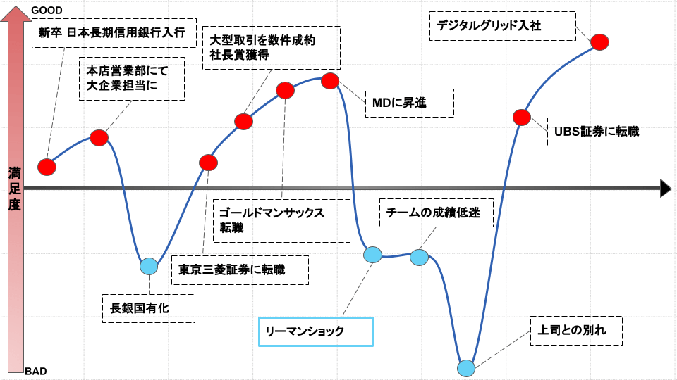 そのような状況の時に、UBS証券の投資銀行部門の本部長と会食の機会がありお声を掛けていただきました。始めてやる仕事だったので、チャレンジではあったのですが、投資銀行部門には非常に興味を持っていたこと、及びUBSは世界最大のウェルスマネジメントを本国で持っていて、日本でも大きいオペレーションをしているので、自分が考えていた4つのうちの2つを兼ね備えているUBSへの転職を決めました。