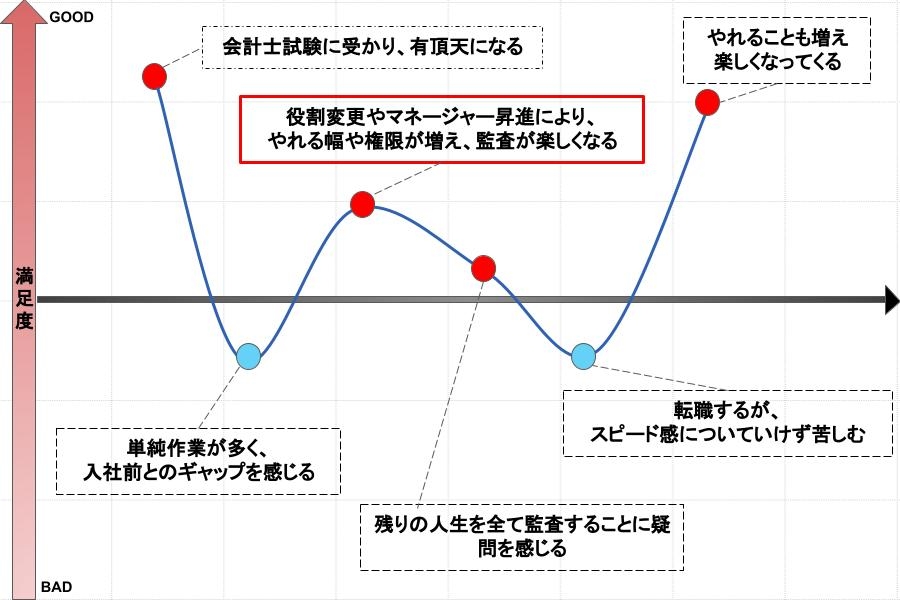 —再びグラフを見ると、入社されて6年目くらいに「役割変更やマネージャー昇進により、やれる幅や権限が増え、監査が楽しくなる」とあり、満足度が上昇していますね。