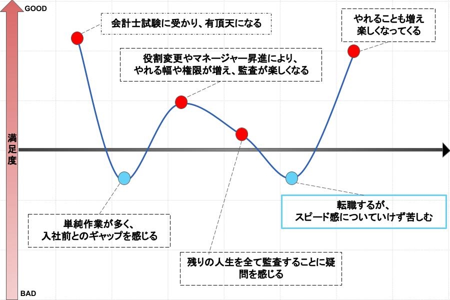 —監査法人10年目に差し掛かったところで、また満足度が下がっていますね。「残りの人生をすべて監査することに疑問を感じる」とありますが、このきっかけは何でしたか。