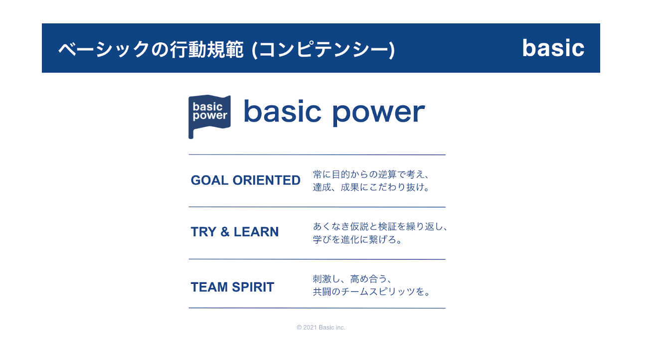 ベーシックでは、働くうえで大事にしたい行動特性をBP(Basic Power)と定義していて、「GOAL ORIENTED」「TRY&LEARN」「TEAM SPIRIT」の三つを定めています。先程の逆算思考(「GOAL ORIENTED」)に加えて、「TRY&LEARN」であれば、とりあえずやってみてそこから学びを得ようという姿勢のことで、これは組織にマインドとして染みついてます。会社の中で課題が出てきても、誰のせいでそうなったのかと責任の所在を問うことはなく、そこから何を学べたかを大事にします。