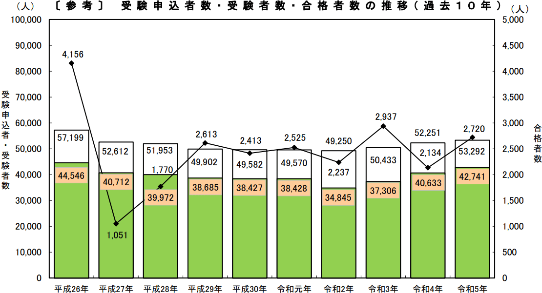 下記は直近10年間の合格者の推移です。基本的に合格率は6~7%となっており、非常に難しい試験であることがわかります。