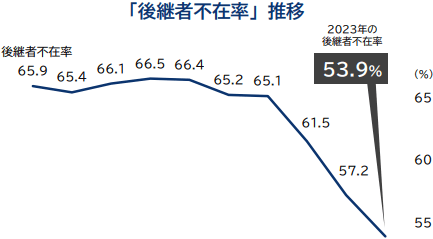 日本においては企業の後継者不足が深刻な問題となっており、2023年の日本企業の後継者不在率は53.9%でした。下表の通り、2021年以降は低下傾向にあるものの、いまだに高水準となっています。