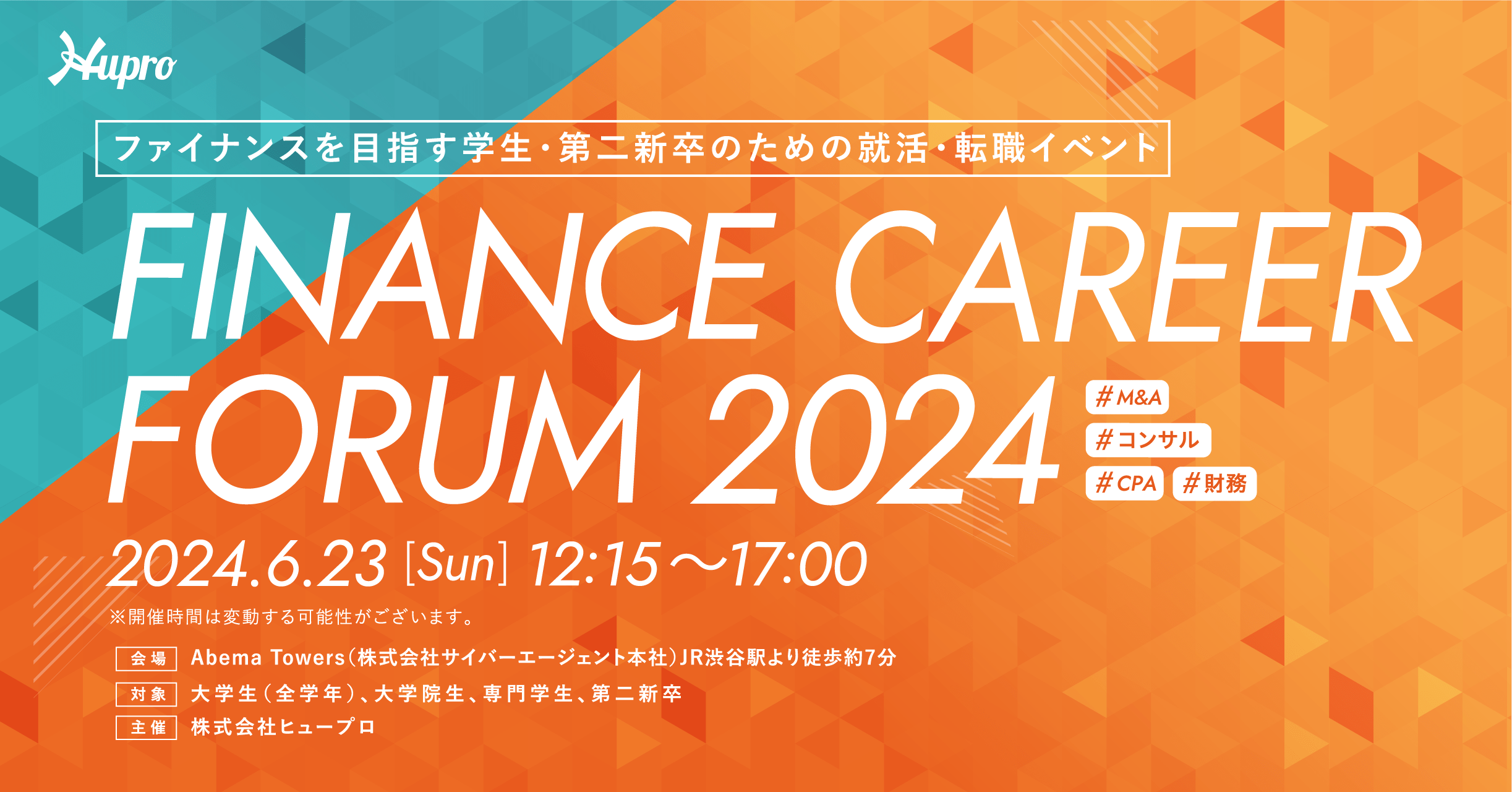 そのような皆様により身近に感じていただけるよう、弊社ヒュープロ主催のファイナンス・会計業界の就活・転職イベントを2024年6月23日 (日) に開催することが決定しました!