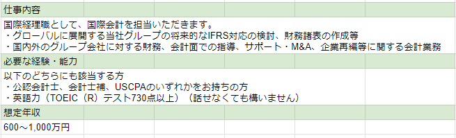 さらに、USCPAは国内よりも海外との取引で真価を発揮する資格であるため、海外勤務経験や国際的な取引を担当する部署などで英語を活かした業務経験が評価の軸になるようです。