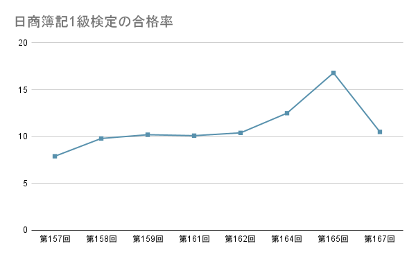「やめとけ」と言われる大きな理由として、簿記1級の難易度の高さが挙げられます。合格率については下表の通り、7%~17%の間で推移しています。