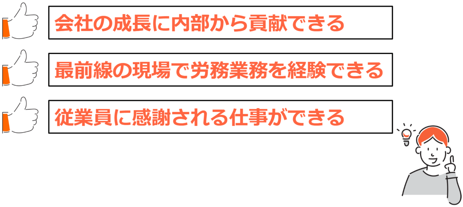 企業の労務として働くことで、様々な課題を知ることができたり、その解決に直接携わることができます。
