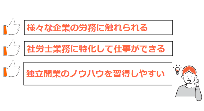 独立して経営者になるために社労士を目指すという方も多いでしょう。そのような方が実際に独立に成功した社労士が代表を務める社労士事務所で働くことで、独立する前に様々なノウハウを学ぶことができます。