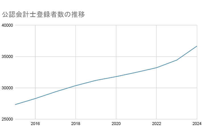 日本公認会計士協会が発表している会員数等調によると、2024年公認会計士として登録されている人数は36,677人でした。