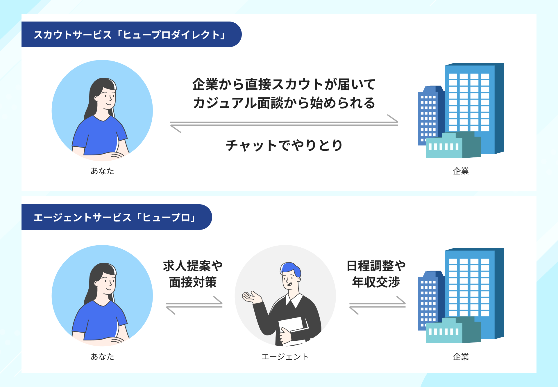 転職支援をするヒュープロが提供する2つのサービス「ヒュープロダイレクト」と「ヒュープロ」の大きな違いは、エージェントの有無。それぞれの特徴をご紹介します。