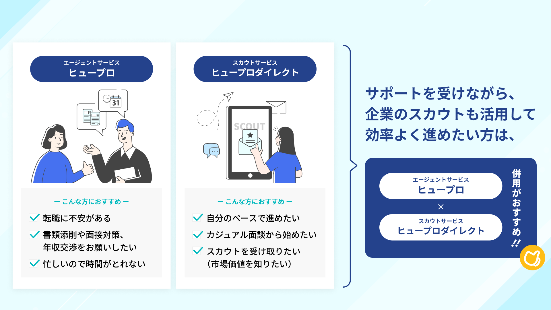 サポートを受けながら、企業からのスカウトも活用したいあなたには、「ヒュープロ」と「ヒュープロダイレクト」の併用がおすすめです!エージェントのアドバイスを受けつつ、企業からのスカウトも活用することで、選択肢を最大限に広げながら効率的に転職活動を進めることができます。幅広い可能性を探りながら、自分に最適なキャリアを見つけることができるでしょう。