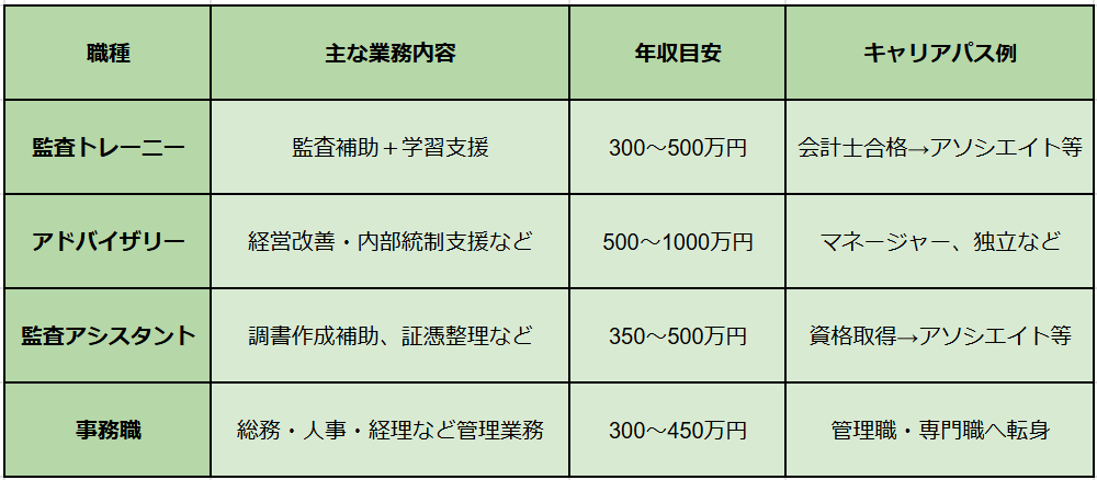 資格なしでも就職できる監査法人の「職種」にはどんなものがあるのでしょうか。