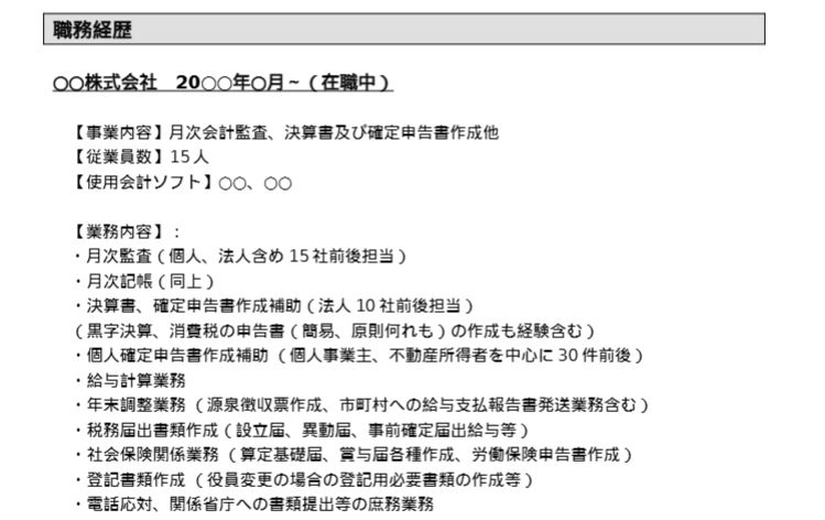 経験年数は、複数社での経験がある場合でも計〇年と書いた方が見やすいです。また、担当件数は個人と法人で分けて「個人〇件/法人〇件」と書くようにしましょう。業務内容については、「月次決算/巡回監査/申告書作成」など、ある程度大枠で書いて構いません。