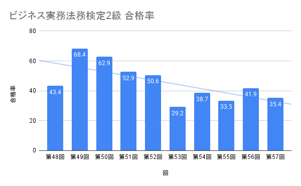 ビジネス実務法務検定2級の合格率は、10回推移でみると低下傾向にあります。第49回は68.4%あった合格率が、第53回には29.2%に低下、最新の合格率も35.4%と、直近の合格率は過去10年で見ると低くなってきているのがわかります。