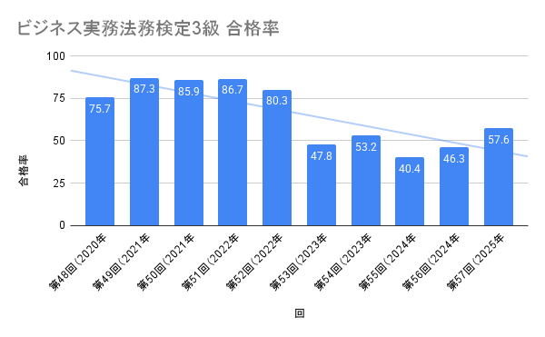 ビジネス実務法務検定3級の合格率は、10回推移でみると低下傾向にあります。第49回は87.3%あった合格率が、第55回には40.4%に低下、最新の合格率も57.6%と、直近の合格率は過去10年で見ると低くなってきているのがわかります。