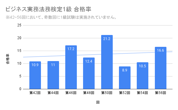 ビジネス実務法務検定1級の合格率は、8回推移でみると大きな変動はないことがわかります。過去8回の最大が21.2%、最小が10.9%であることを考えると、最新56回の16.6%という値は平均的であると評価できます。