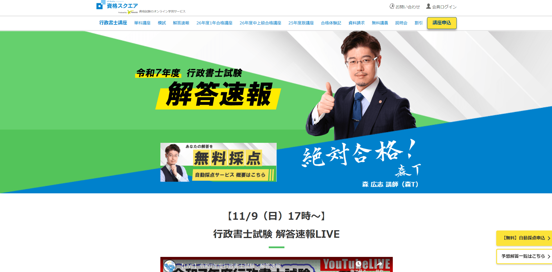 資格スクエアでは、業界最速クラスの試験当日11月9日(日)17時から解答速報ライブが配信されます。
