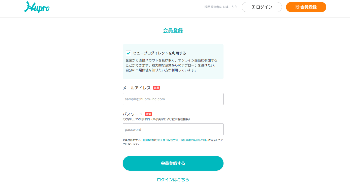 ちなみにヒュープロダイレクトは、以下の画像のようにヒュープロ登録時にチェックを入れるだけで、同時に登録可能です。