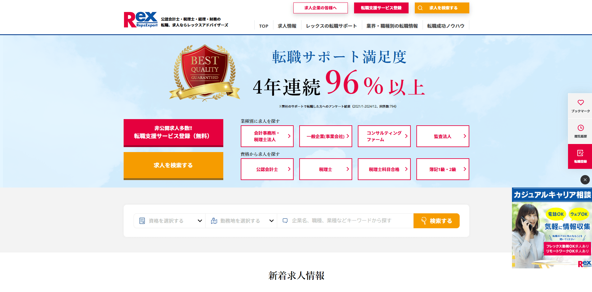 レックスアドバイザーズは会計士・税理士・管理部門経験者に特化した転職支援を提供。会計事務所、税理士法人、監査法人、国際税務、M&A、相続関連など幅広い案件を取り扱っており、幅広く求人を検討したい方に向いています。