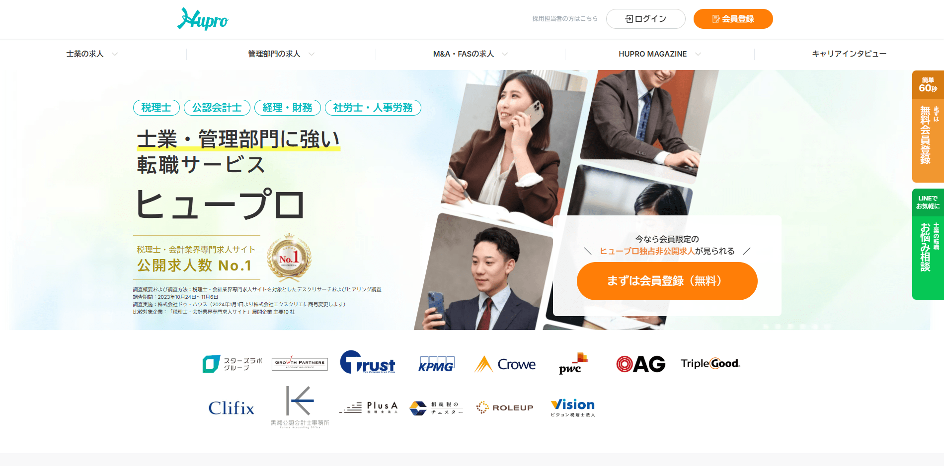 業界最大級の求人数を誇る「ヒュープロ」は、士業・管理部門に特化した求人を多数保有しており、公開・非公開求人の両面から転職先を選べます。