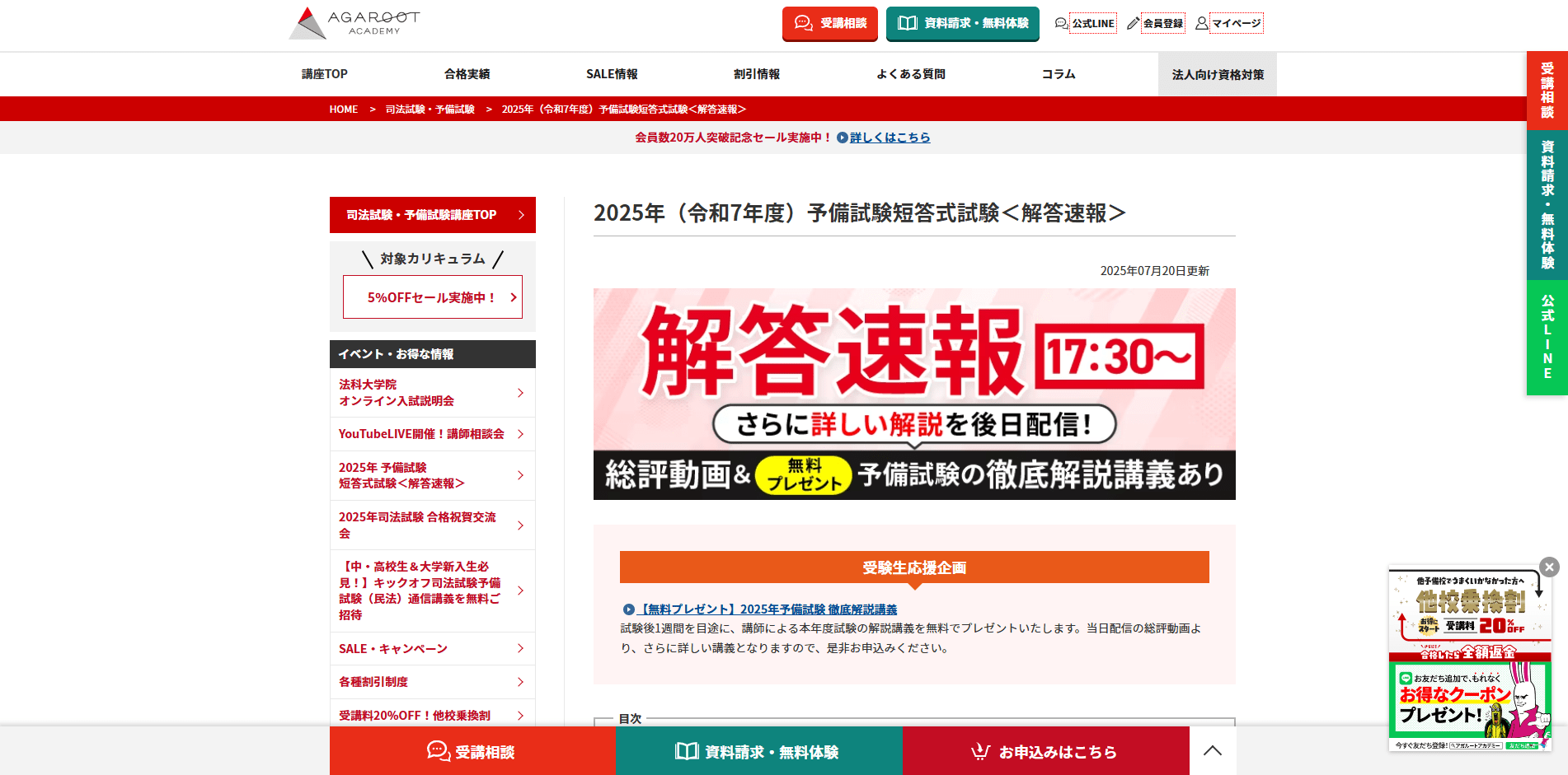 アガルートでは、試験当日7月20日(日)の正午過ぎに、法律科目の解答速報が順次公開されました。